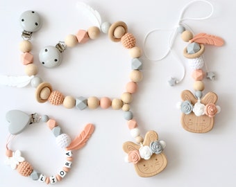 Seesternchen Kinderwagenkette Hase Schleife Grau Rosa